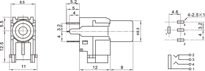 AV插座 AV-8.4-12 90度臥式2P插板 左側邊帶孔 黃色底座