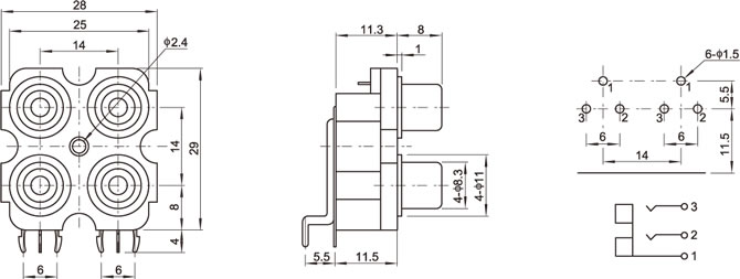 AV插座 AV4-8.4-3 90度雙層雙聯排6P插板 有孔 白紅色插口