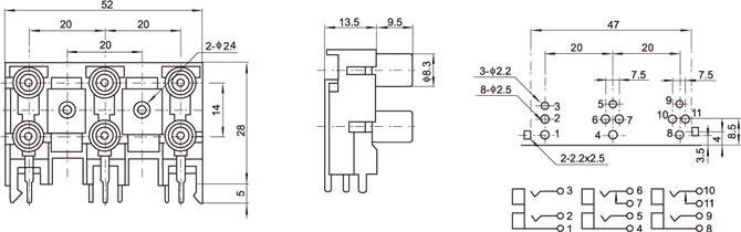 AV插座 AV6-8.4-5B 90度雙層三聯排11P兩腳插板 雙螺孔 黃白紅色插口