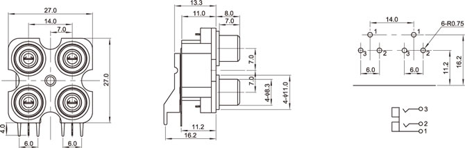 AV插座 AV4-8.4-7PZ 90度雙層雙聯排6P插板 有孔 黃白紅色插口