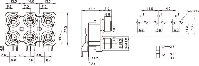 AV插座 AV6-8.4-7 90度雙層三聯排9P插板 雙孔 黃白紅色插口