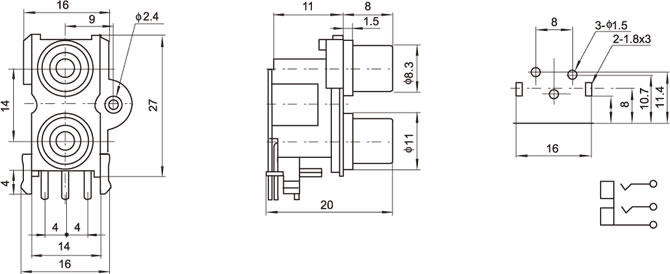 AV插座 AV2-8.4-9 90度雙層3P兩腳插板 帶螺孔 白紅色插口