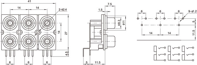 AV插座 AV6-8.4-10B 90度雙層三聯排9P插板 雙孔 白紅黃藍黑色插口