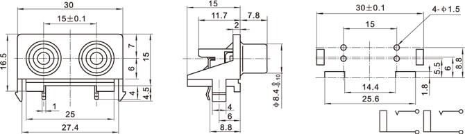 AV插座 AV2-8.4-11 90度雙聯排4P兩腳插板 黑色底座 紅白色插口