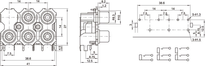 AV插座 AV5-8.4-13P 90度雙層五聯排8P兩腳插板 雙孔黑色底座 綠藍紅白4色插口