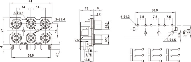 AV插座 AV5-8.4-13P3 90度雙層五聯排 8P兩腳插板雙孔 綠白紅藍四色插口