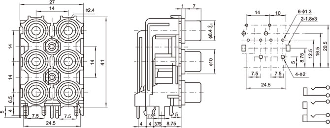 AV插座 AV6-8.4-13BP 90度三層雙聯排12腳插板 兩孔黃色底座 四色