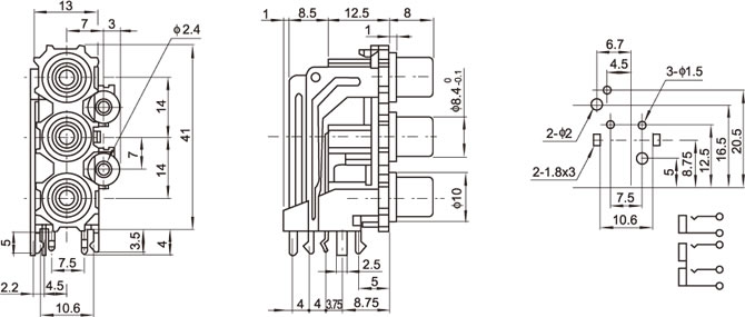 AV插座 AV2-8.4-13D 90度雙層3P兩腳插板 帶螺孔 黑底座