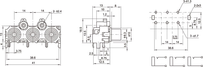 AV插座 AV3-8.4-14P(H) 90度三聯排6P兩腳插板 雙螺孔 紅色底座