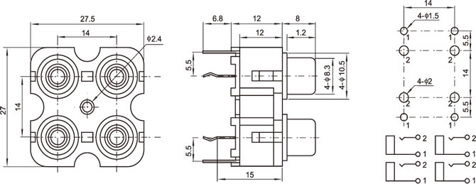AV插座 AV4-8.4-20B 立式180度八腳插板 四聯排 有孔鍍金外殼