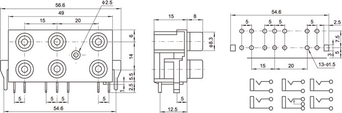 AV插座 AV6-8.4-27 90度雙層14P插板兩腳 三聯排有孔