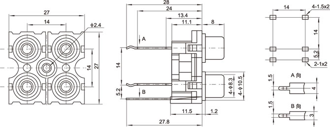 AV插座 AV4-8.4-32B 180度立式6P直插 四聯排加長腳 墊高