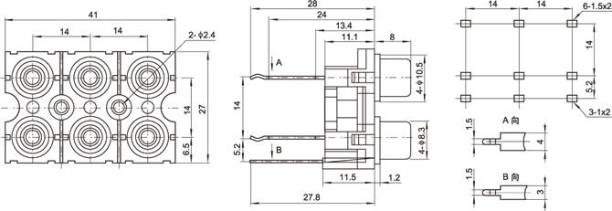 AV插座 AV4-8.4-32B 180度立式6P直插 四聯排加長腳 墊高