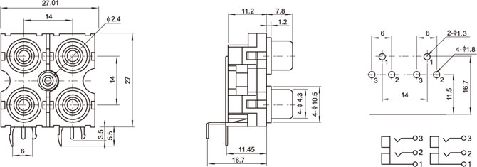 AV插座 AV2-8.4-33 90度雙層3P插板 帶螺孔 紅白雙色