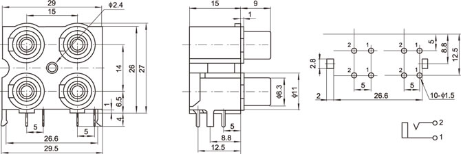 AV插座 AV2-8.4-40P 90度雙聯排六腳插板 帶螺孔 紅白雙色