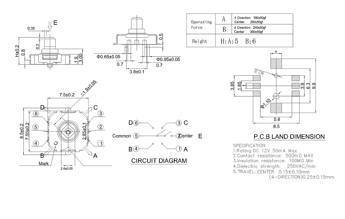 MultiFunctional Five-way Switch Light Tact Five-way Switch technical parameters: