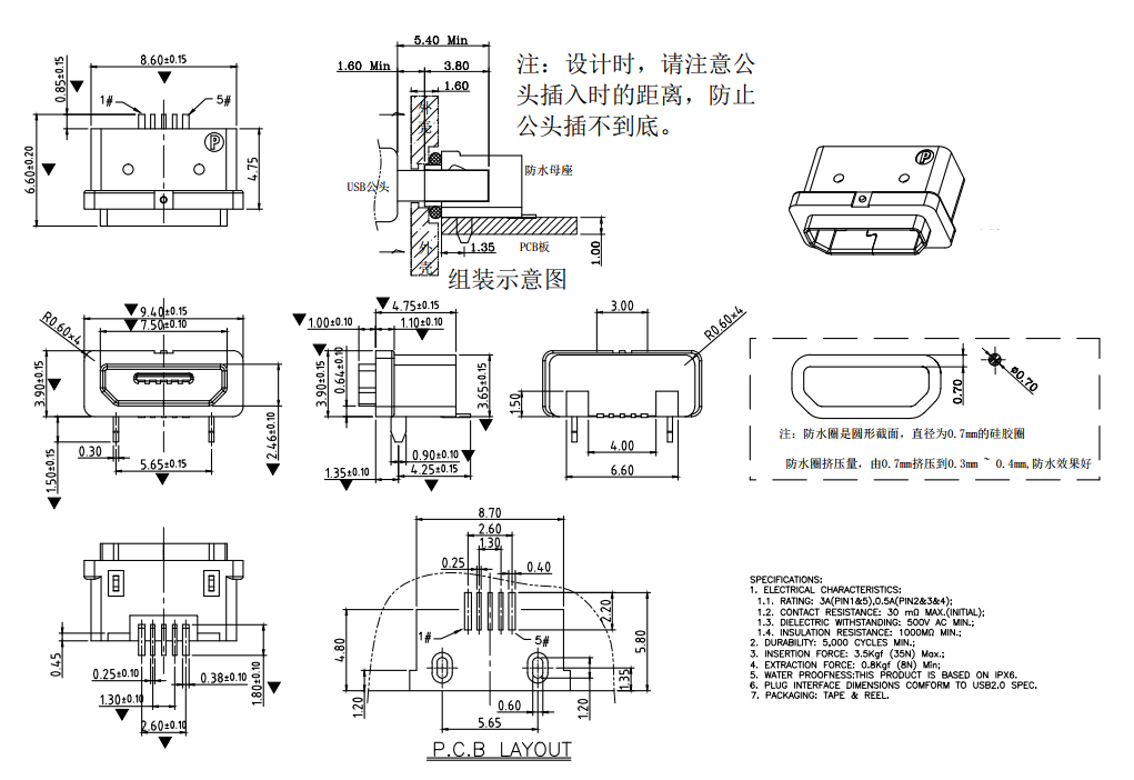 MUB-B-5-MM-B-PG8.85-6P-W (MICRO USB 母座 / PG8.85定位6腳/ 防水墊圈)