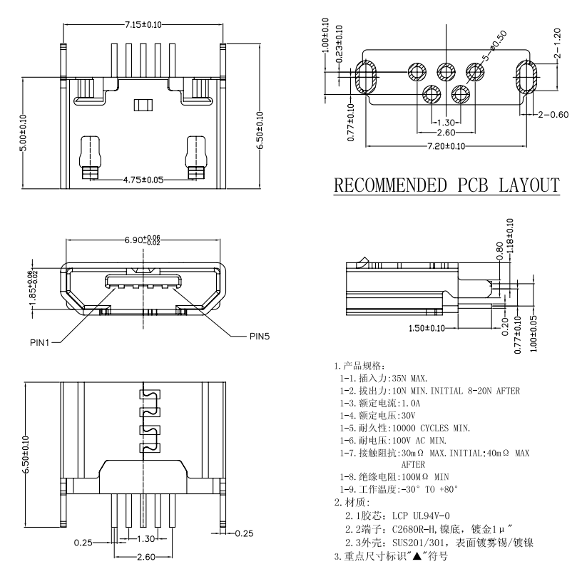 MUB-B-5-EM-0-V0.7-PG11.0-4M-N (MICRO USB 母座沉板/0.7 / PG10.3平貼4腳/ 直邊破板 )