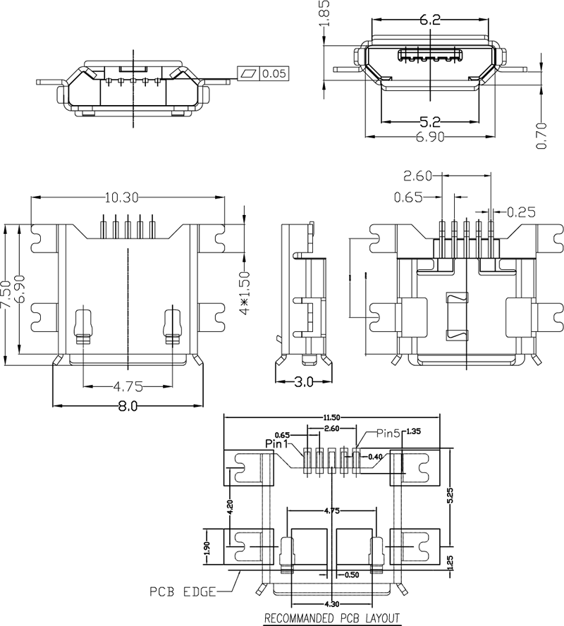 MUB-B-5-EM-0-V0.7-PG11.0-4M-N (MICRO USB 母座沉板/0.7 / PG10.3平貼4腳/ 直邊破板 )
