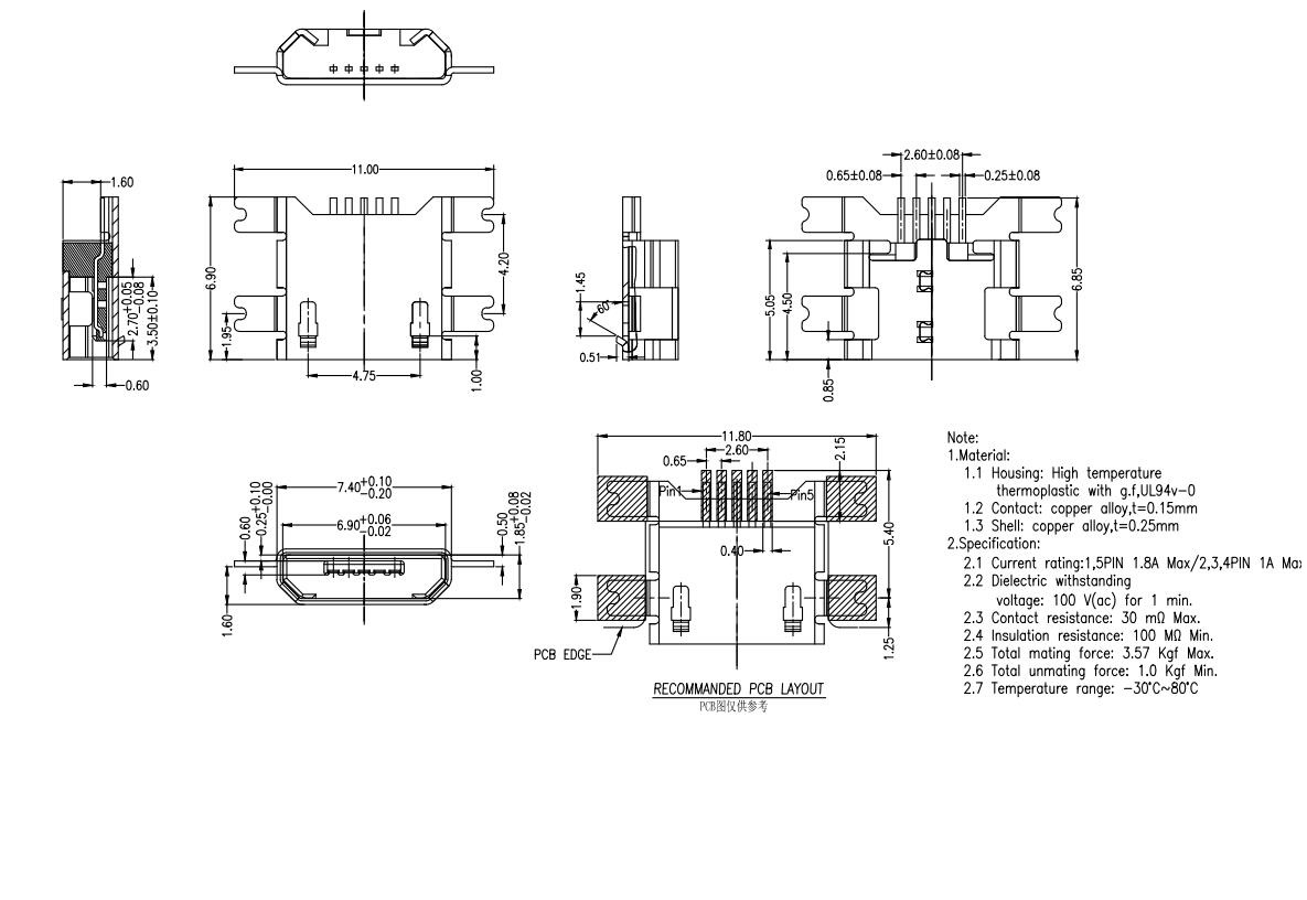 MUB-B-5-EM-0-V1.6-4M-PG11.0-N (MICRO USB 5P母座沉板 /1.6/PG11.0平貼4腳 / 直邊)