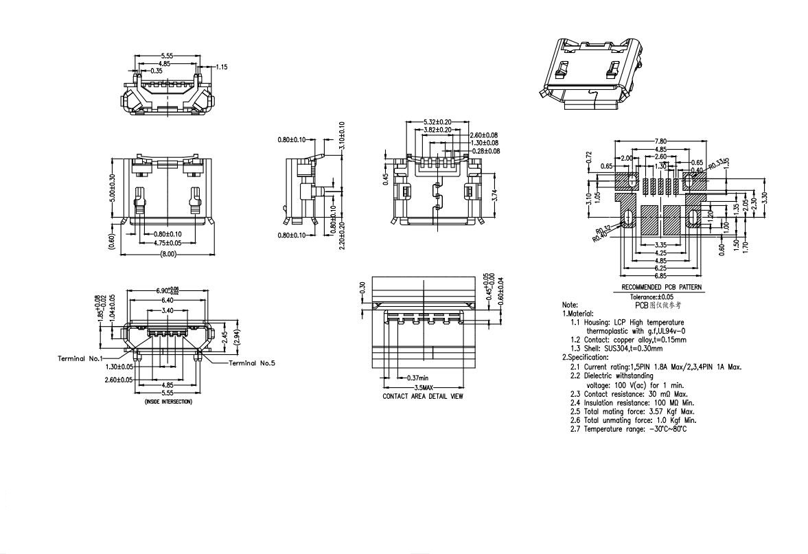 MUB-B-5-EM-0-V1.6-4M-PG11.0-N (MICRO USB 5P母座沉板 /1.6/PG11.0平貼4腳 / 直邊)