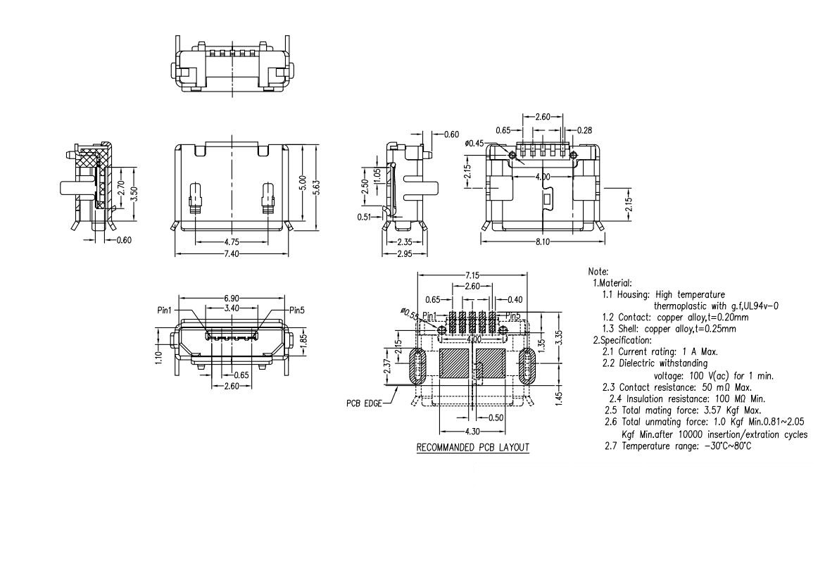 MUB-B-5-AB-0-V0.75-2P-PG7.2-S (MICRO USB 5P母座 AB0.75 /腳距7.2定位/ 卷邊)