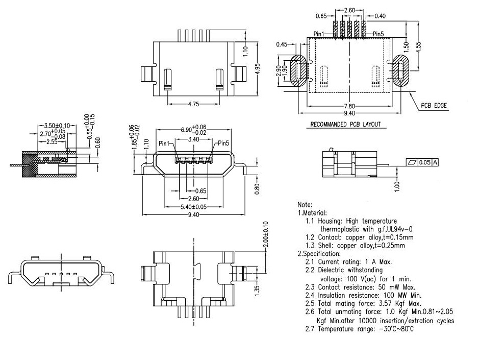 MUB-B-5-EM-0-V1.0-2P-PG9.4-N (MICRO USB 5P母座 沉板1.0 /2定位/ 直邊)