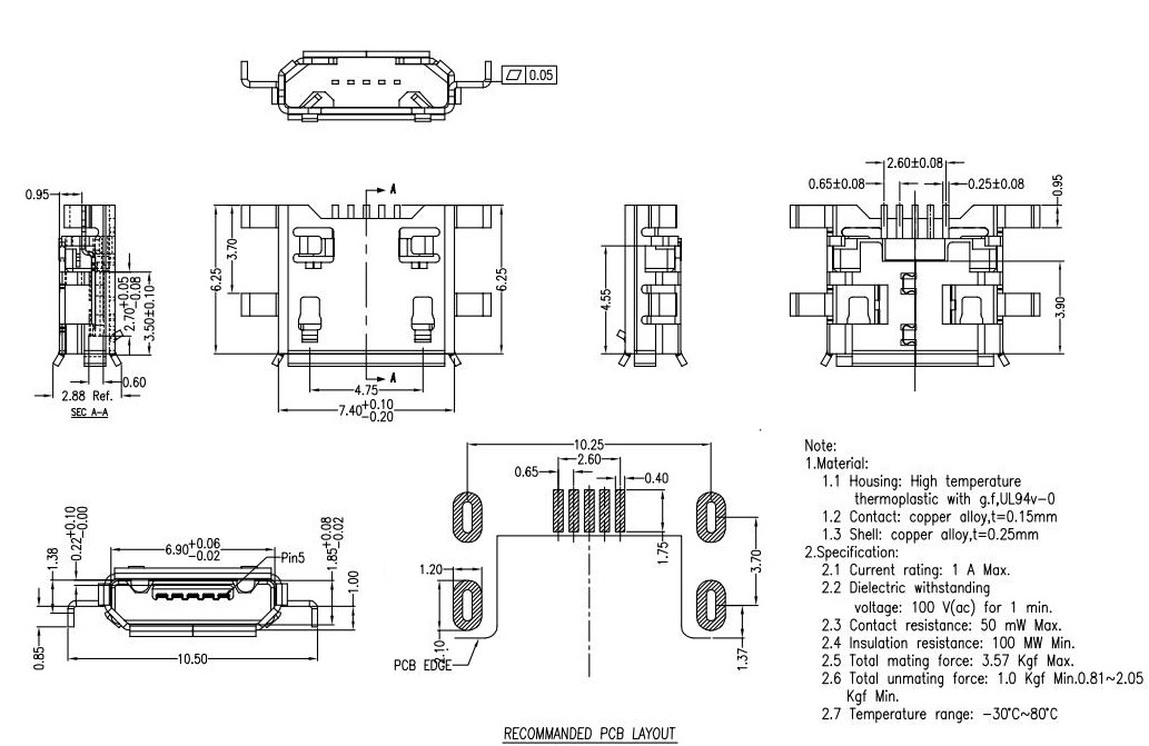 MUB-B-5-TM-0-V0.75-2P-PG5.9/5.65-N (MICRO USB 5P母座焊線/ 腳距5.9/5.65 定位+焊腳 /針腳0.75 直邊)