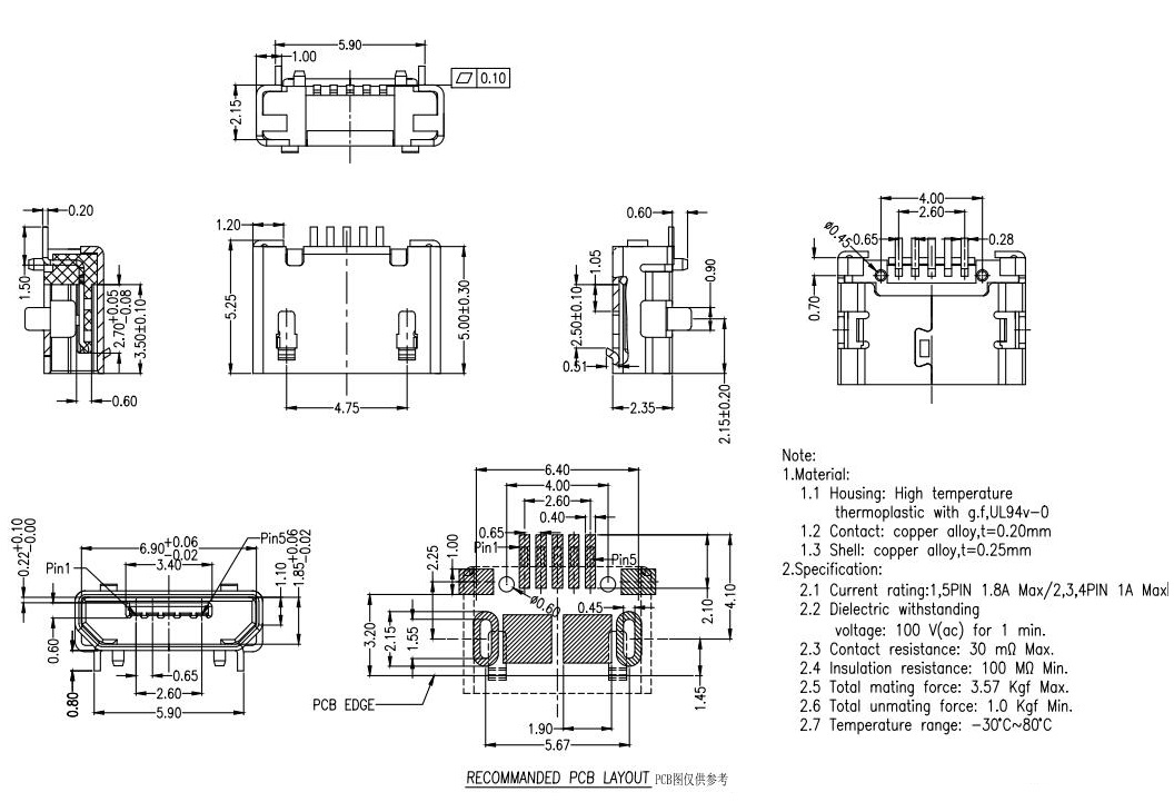MUB-B-5-TM-0-V0.75-2P-PG5.9/5.65-N (MICRO USB 5P母座焊線/ 腳距5.9/5.65 定位+焊腳 /針腳0.75 直邊)