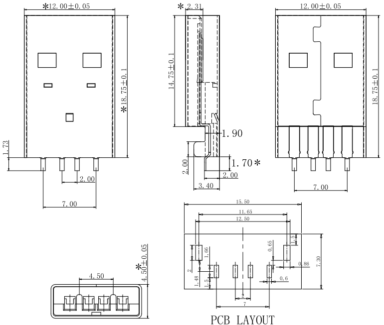 UB-A-2.0-4-E-MM-K-18.75-0(USB 2.0 / 公頭沉板 /SMD 黑膠)