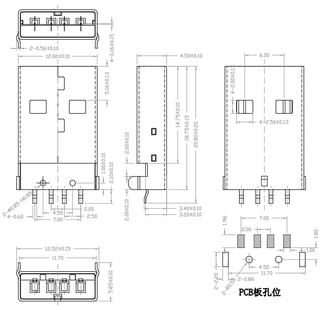 UB-A-2.0-4-E-MM-W-18.7-(P定位) (USB 2.0 / 公頭沉板 / SMD 白膠有柱)