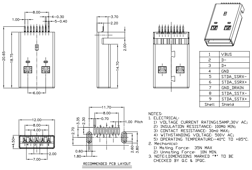UB-A-3.0-9-E-MM-B-18.75-(P定位) (USB3.0/公頭沉板/2.3/2腳插板SMD/定位柱)