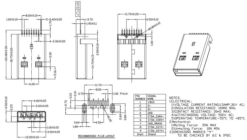 UB-A-3.0-9-E-MM-B-18.75-(P定位) (USB3.0公頭 / 沉板SMD1.75腳 / 2定位柱)