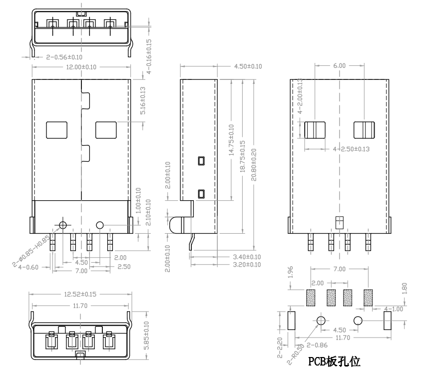 UB-A-2.0-4-E-MM-W-17.15-(K帶槽卡點) (USB 2.0 雙面插公頭/長體焊線/帶槽卡點/地腳)