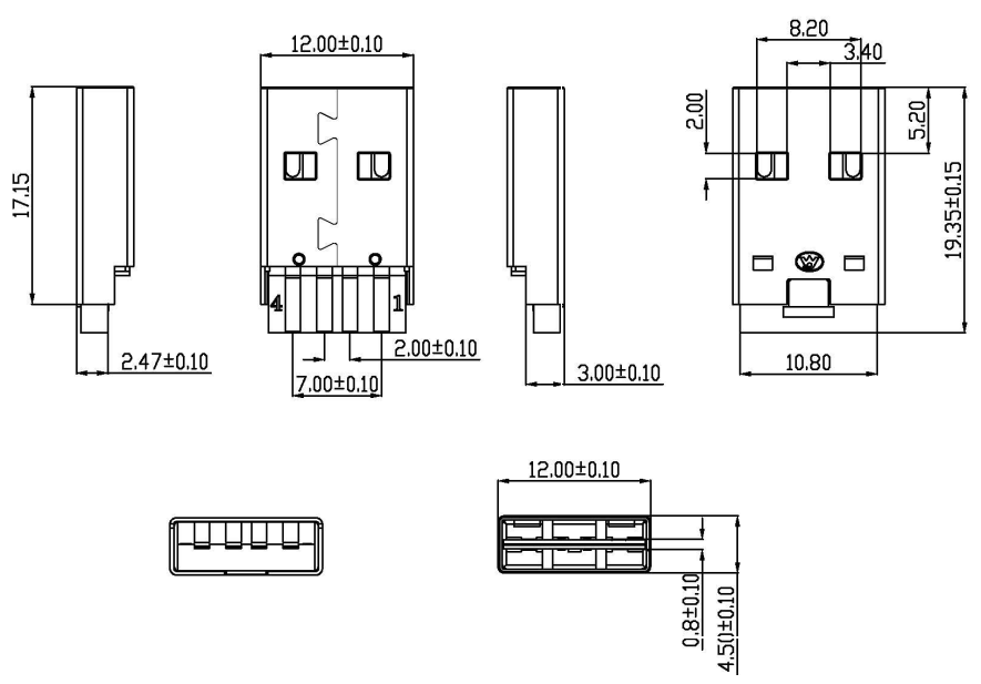 UB-A-2.0-4-E-MM-W-17.15-(K帶槽卡點) (USB 2.0 雙面插公頭/長體焊線/帶槽卡點/地腳)