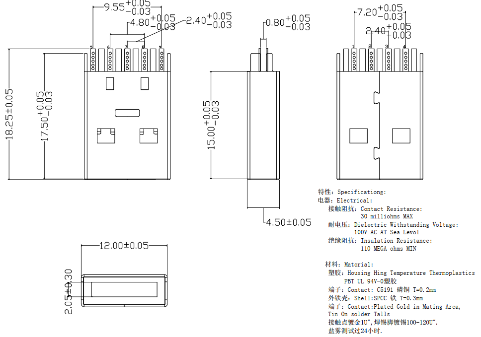 UB-A-2.0-4-E-MM-W-14.75-0 (USB2.0 / 公頭 / 沉板 / 白膠)