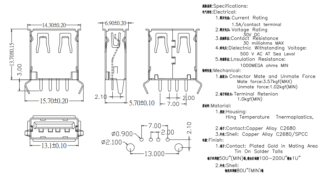 US-B-2.0-4-HD-W-13.7-N/S-2SP (USB 2.0 雙面插 / 12.0 插件 / 直邊 / 卷邊 / 定位彎腳 )