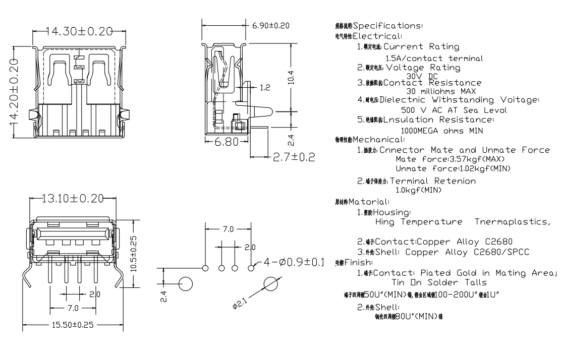 US-B-2.0-4-MD-W-14.2-S-J-2P(USB 2.0 / 14.0 插件 / 後蓋 / 卷邊 / 定位)